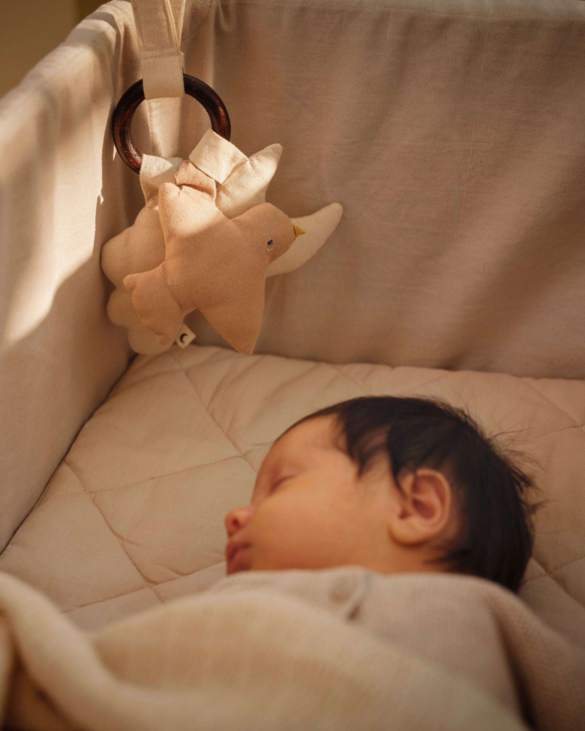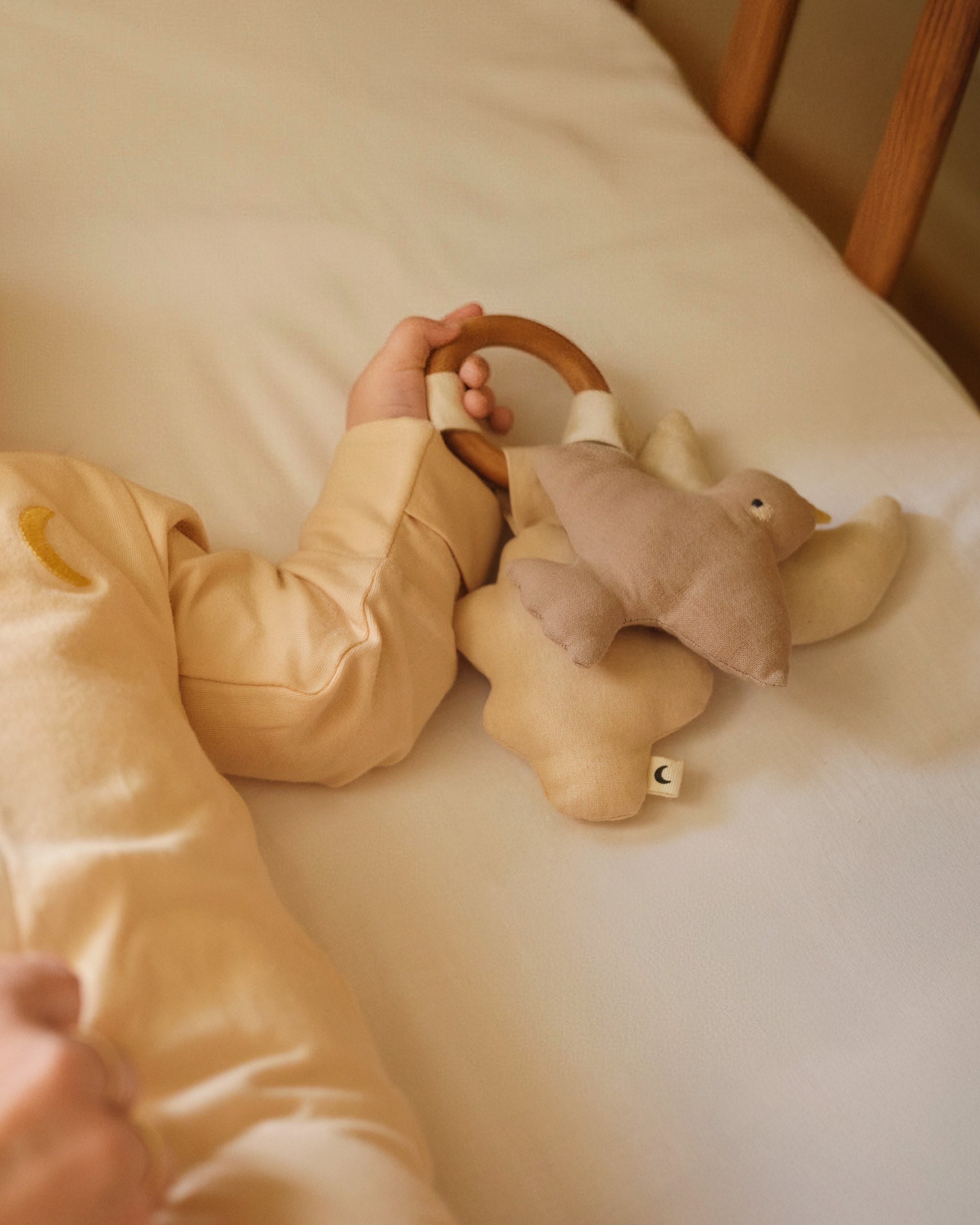 Hver av de delikate figurene er trygt festet til en babysikker ring, som er laget av vakkert valnøtt-tre, og skaper et beroligende leketøy for den lille. Nattleketøyet er designet for å gi komfort og berolige, og det gir en fin sanseopplevelse som forbedrer leggeritualet og gir trygghet når babyen skal sove.