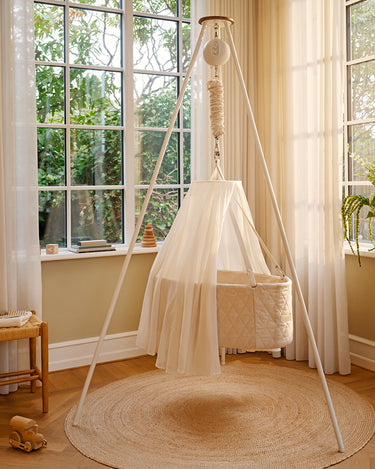 Vi anbefaler også vår Heaven, som er en sengehimmel til vuggen. Den reduserer lyset fra omgivelsene og minimerer søvnforstyrrelser. Dessuten et ekstra lag sikkerhet med vår Madrass Fixi, som holder den lille liggende tett og sentrert på madrassen.